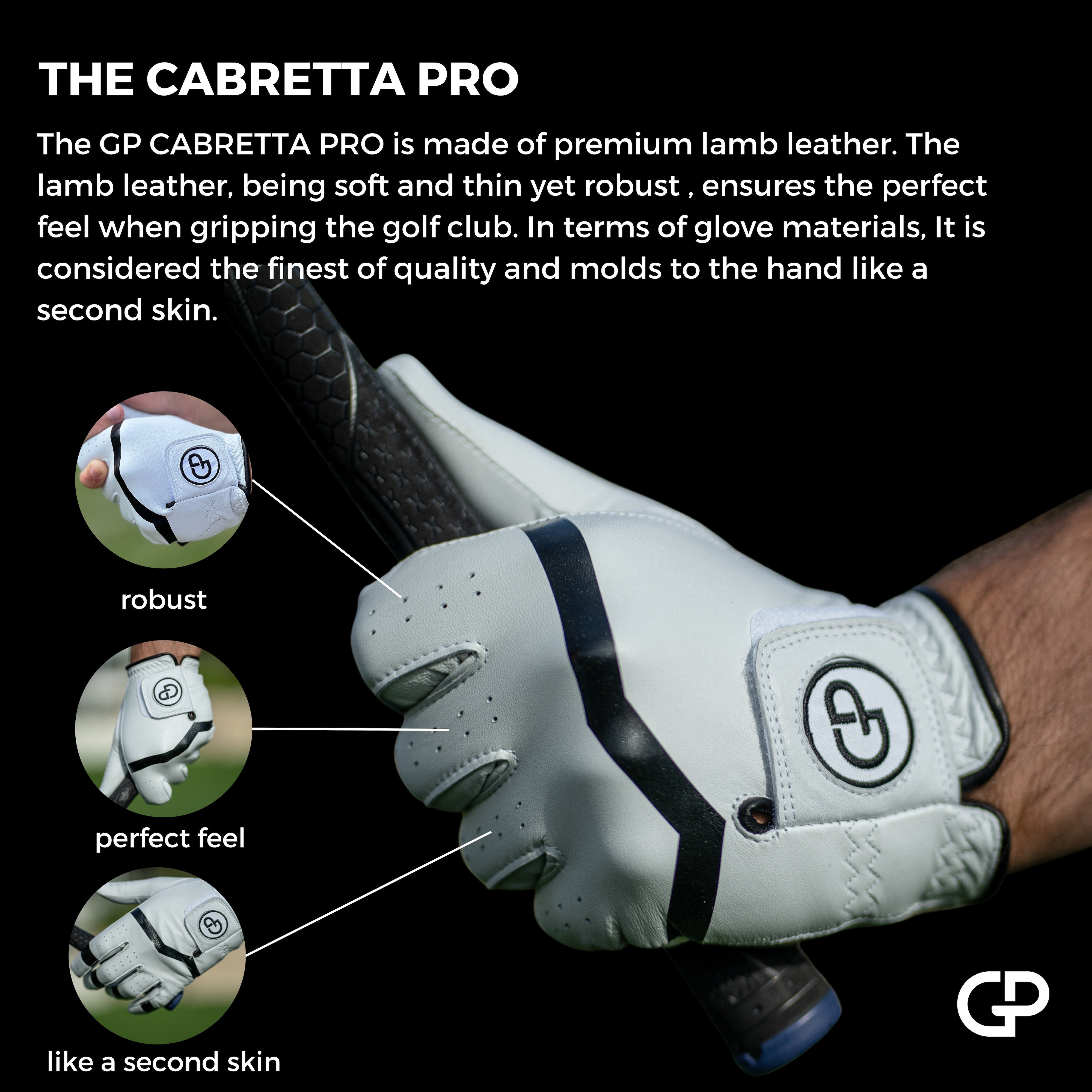 As the name suggests, the GP CABRETTA PRO is made of the highest quality Cabretta leather. The Cabretta leather (lambskin) with its soft and thin but robust leather ensures the perfect feel when gripping the club. It is considered the non-plus-ultra in the glove sector and fits the hand like a second skin. This feeling ensures that YOU can get the best out of every single shot.